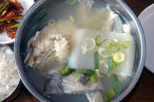 海雲台のテグタンは、赤い唐辛子が入ってない淡白なスープです。いわゆる日本でいうちり鍋です。 白子や肝などは入れないテグタンは、淡白であっさりしたタラの頭とボリュームのある肉厚の白身、煮込まれた大根、ネギ、赤い唐辛子は使わないが、粉の青唐辛子は少し入っていて、ピリッと辛いスープはさらに食欲を誘ってくれます。 辛いものがまったく食べれない方もこのテグタンは気軽に食べれます。 また、プサン地下鉄2号線の近くにあるリベラホテルの手前にも支店がありますので、この店でもさっぱりしたテグタンを味わうことができます。