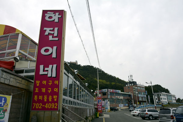 チョゲグイとジャンオグイの専門店であるハジニネは、海雲台海水浴場と松亭海水浴場の間にある小さい港町、青沙浦(チョンサポ)貝焼き通りにあります。この貝焼き通りは海辺に貝焼き専門店が立ち並ぶ通りで、釜山地下鉄2号線の海雲台(ヘウンデ)駅や海雲台海水浴場などからタクシーで10分ほどの場所にあります。