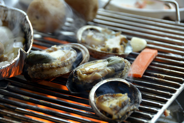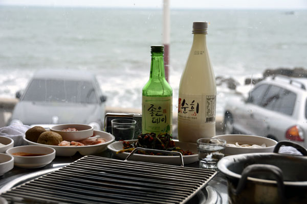 釜山を訪れる皆さん! 絶え間 なく打ち寄せる波を見ながらお刺身の代わりに焼酎を飲みながら食べる貝焼きはいかがでしょうか