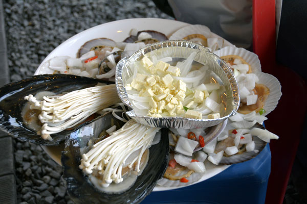 玉ねぎとバターを入れたアルミホイルの簡易鍋に、軽く焼いたホタテとタイラギ貝を食べやすいサイズで切って煮付けたアルミホイル貝焼きはとても美味しいです。また、ジャンオ(アナゴ)焼き、アワビ焼き、メバル焼きも美味しいです。