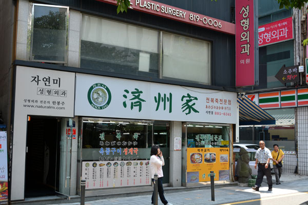 夜になりますとお酒の飲める屋台がたくさん並び、杯を交わす人たちで賑わう西面のロッテホテルの裏通りは、韓国の辛口料理に苦手な日本観光客ための食堂も何軒がありますが、釜山港の近くにある南浦洞(ナムポドン)で朝ごはんとして日本観光客に大人気を集めたアワビ専門店、済州家本店が、2009年、西面のランドマークでもあるロッテホテル・百貨店のすぐ裏通りに済州家(西面店)をオープンしました。