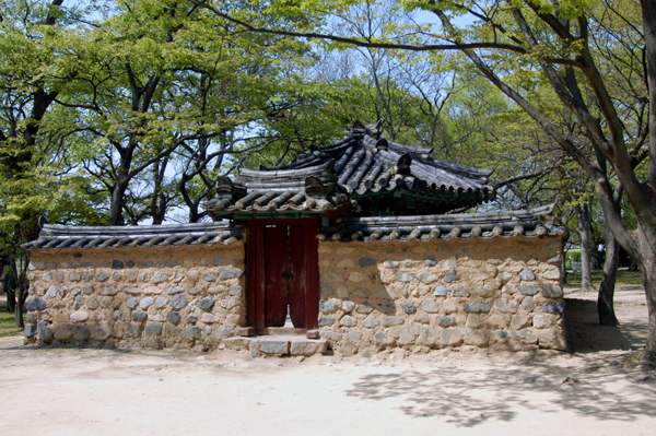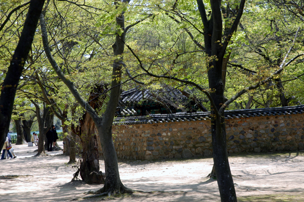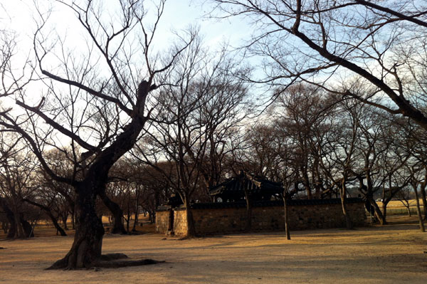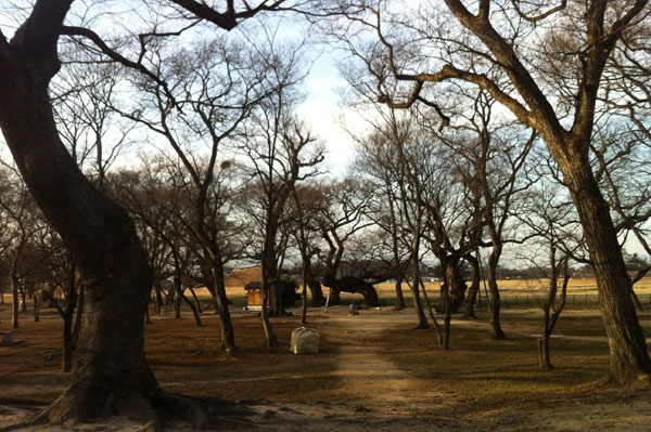 かつての新羅の王宮が位置していた月城のすぐ下にある鶏林は、慶州金氏の始祖に当たる金閼智(キムアルチ)の誕生説話が漂う由緒ある場所です。慶州歴史遺跡地区の月城地区にある東洋最古の天文台と言われる瞻星台の前にある矢印の案内板に従って月城のほうへ少し足を伸ばすと右側にケヤキの木などの古木が生い茂る静かな林がありますが、その林が金閼智(キムアルチ)の誕生説話が伝わる鶏林(ケリム) です。