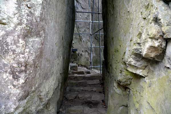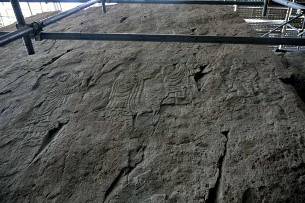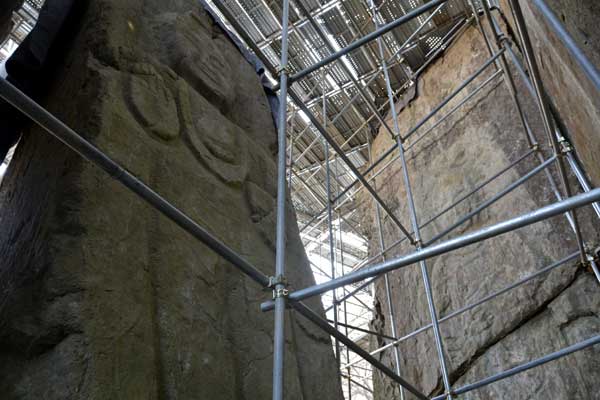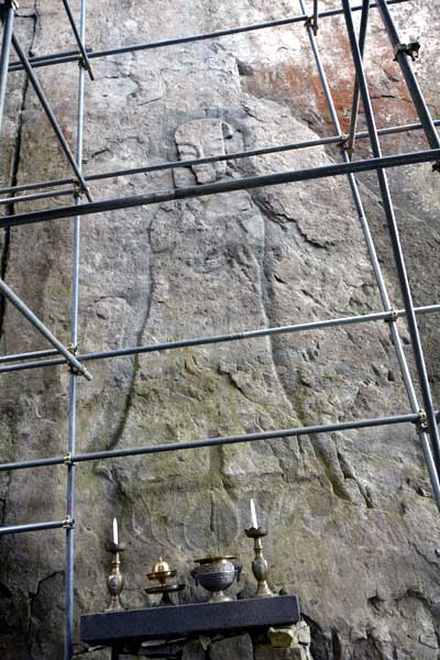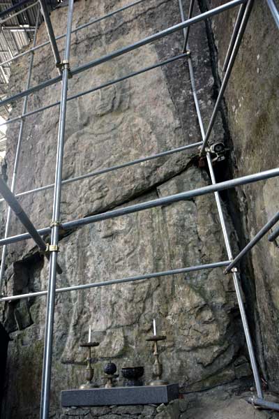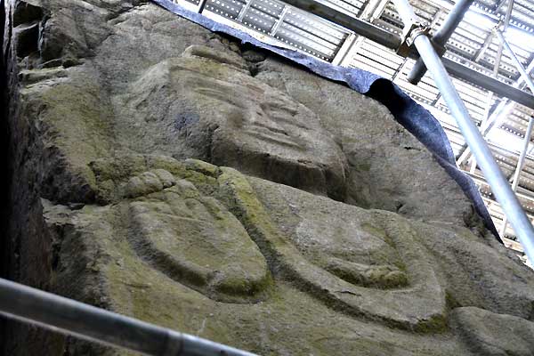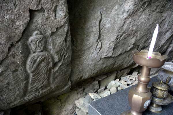 金庾信が三国統一のために祈った神仙寺(シンソンサ)が断石山の中腹にあり、お寺から50メートルほど離れているところにまるで切断されたかのように見えるコの字形に並んだ高さ18メートル、幅3メートルの巨大な岩があります。西は入口にし、東・南・北岩壁には10体の弥勒本尊仏、菩薩立像、半跏思惟像、400余字の銘文などが彫刻されています。