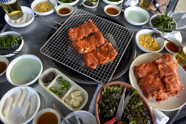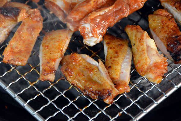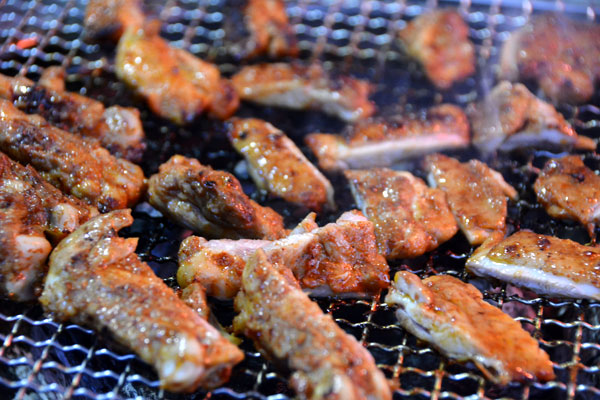 この店には、野外にもテーブルがあり、鶏肉を炭火でじっくり焼きながら余分な脂を落とし、その煙で肉を燻して香りをつけて食べる春川式のバーベキュー「春川タッカルビ」が楽しめます。