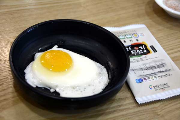 全州コンナムルクッパは、調理方法によって二種類に分けられますが、以前、紹介したことのあるウェンイ・コンナムルクッパは、イカ、玉ねぎなどで作ったダシスープの中にご飯と事前に煮込んであるコンナムル(豆もやし)をその上にだっぷりかけて沸騰させずに食べる南部市場式のコンナムルクッパと言いますが、こちらの豆もヤシのクッパは、ご飯、豆もやし、卵を入れたスープが沸騰したらネギ、ゴマ、粉唐辛子などの薬味を加えてさらにぐつぐつ煮立たせて食べるコンナムルクッパです。
