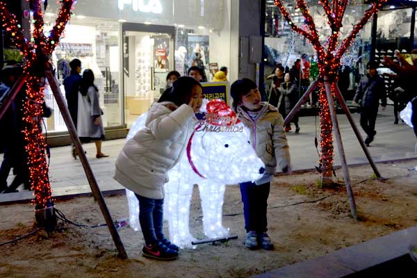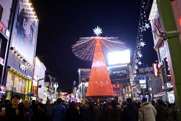 こんにちは、釜山南浦洞の光復路で開催される今年の釜山クリスマスツリー文化祝祭は、2071年12月2日から2018年1月7日まで釜山夜空を美しく華麗に彩ります。12月の初めての日曜日を迎えて、子供連れやカップなどの大勢の人々が光復路を埋め尽くされ、去っていく2017年を惜しみながらひと時を楽しみました。