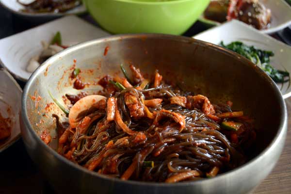 釜山(プサン)から西へ1時間30分ほど行ったところにある慶尚南道(キョンサンナムド)・晋州(チンジュ)で味わえる晋州ビビンネンミョンと晋州ビビンパッです。両方とも牛肉を用いますが、晋州ビビンパッは生の牛肉の赤身を細かく切って野菜と一緒に混ぜて食べるご飯であり、晋州ビビンネンミョンは牛肉チヂミを麺と一緒に食べる晋州の名物料理です。