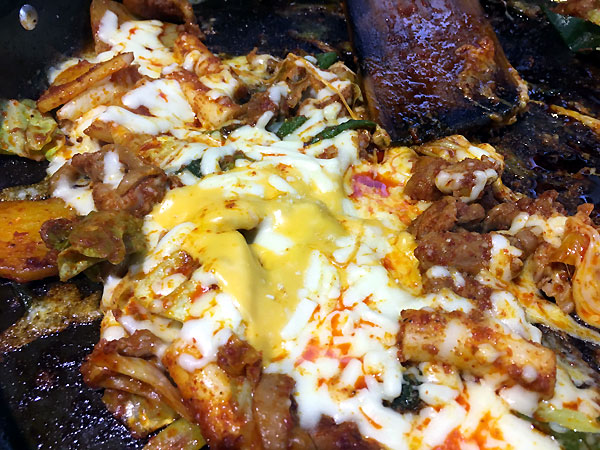 こんにちは、釜山南浦洞のBIFF広場で営業しているユガネタッカルビ南浦店のチーズタッカルビです。鉄板で炒めた野菜とタッカルビの上にチーズをまいて食べるチーズタッカルビです。チーズをかけたタッカルビは柔らかく食べやすかったんでした。